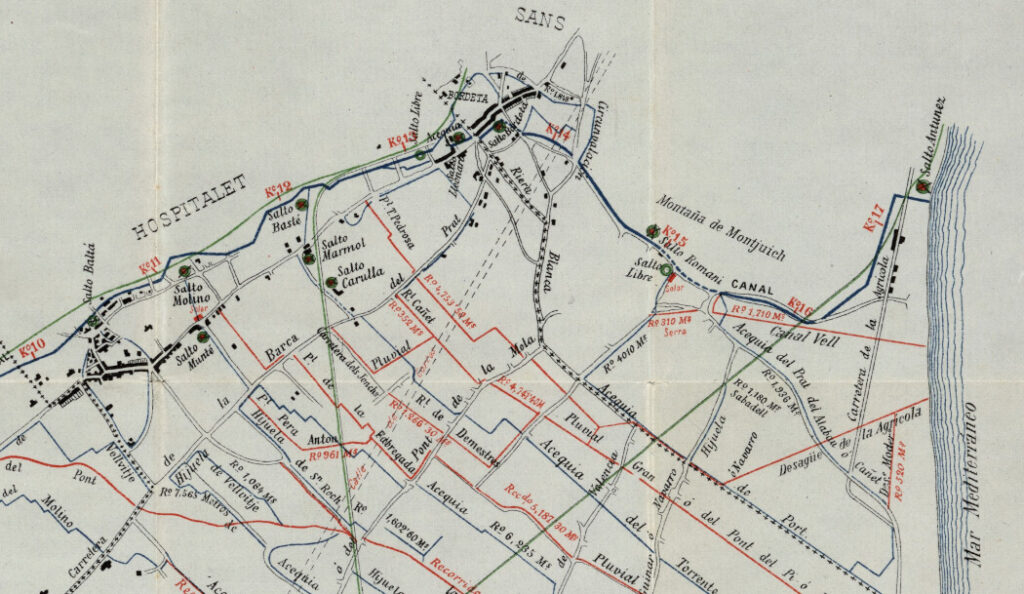 3. Com es pot veure en un mapa del 1908 (ICGC – Real canal de la Infanta Dª Luisa Carlota de Borbón), el Canal de la Infanta tenia més de vint salts d’aigua al llarg del seu recorregut i per tota la zona de la Marina, la qual regava d’aigües procedents del Llobregat a través de dels ramals secundaris i de moltes sèquies. Tretze d’aquests salts estaven situats a la conducció principal, la qual arribava des de L’Hospitalet de Llobregat a la fàbrica de Can Batlló i d’allà conectava amb la Carretera de Port, actual Carrer de la Mare de Déu de Port. Desembocava al mar a la zona de Can Tunis. ↩︎